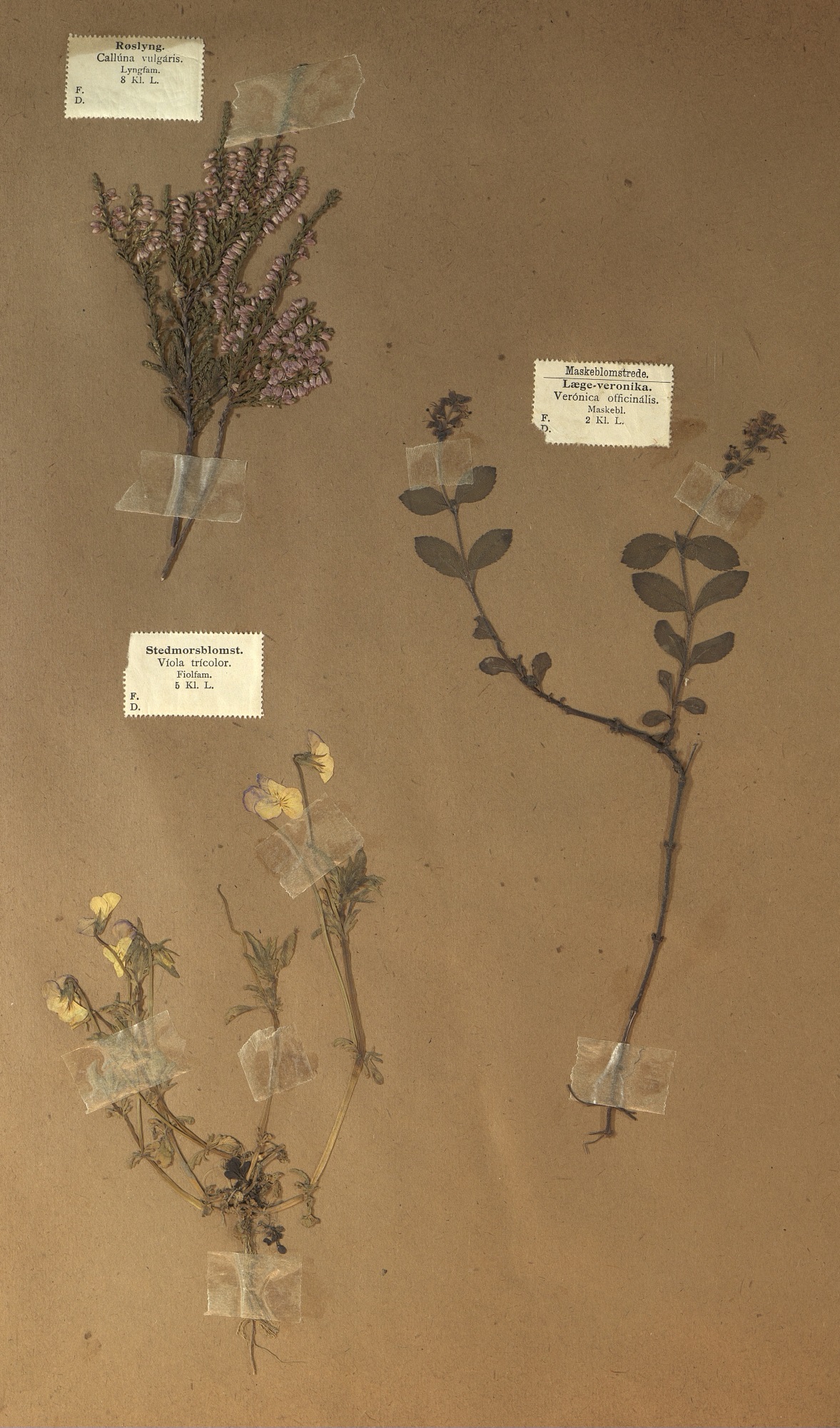 Mange botaniske museer har store herbarier i sine samlinger. Ulike planter som er blitt presset, tørket og merket, og som gir et utsnitt av floraen i et område på et gitt tidspunkt. I arkivene på KUBEN kan en imidlertid også finne denne typen avtrykk. Dette er utdrag fra et herbarium fra 1906 som har tilhørt Anders Torjussen. (Arkivref: PA-1123, Torjussen, Anders. Austre Moland, Y02 L0001).