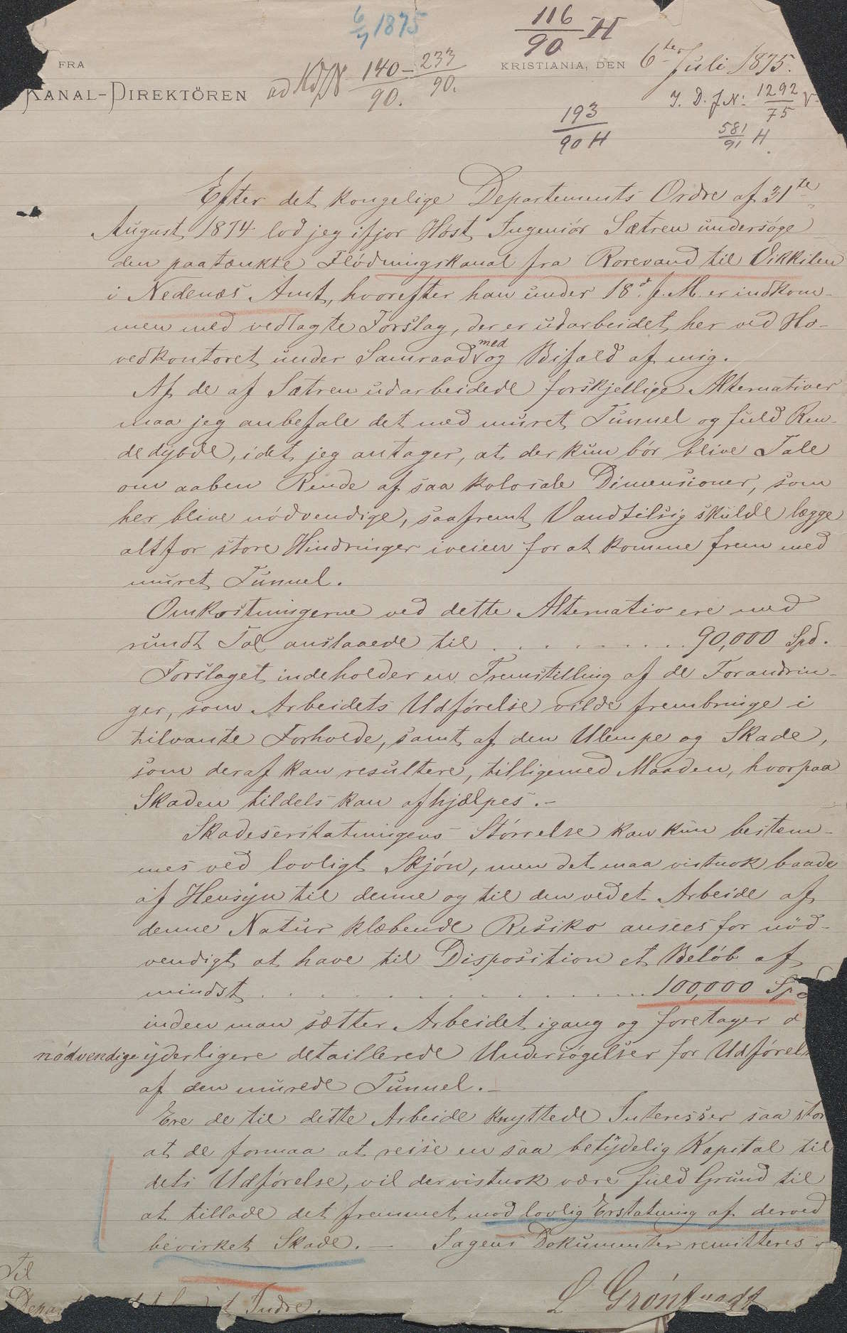 Utredningen ble foretatt av ingeniør Gustav Sætren på oppdrag fra kanaldirektør Lars Grøntvedt. 18. juni 1875 leverte Sætren sitt forslag.