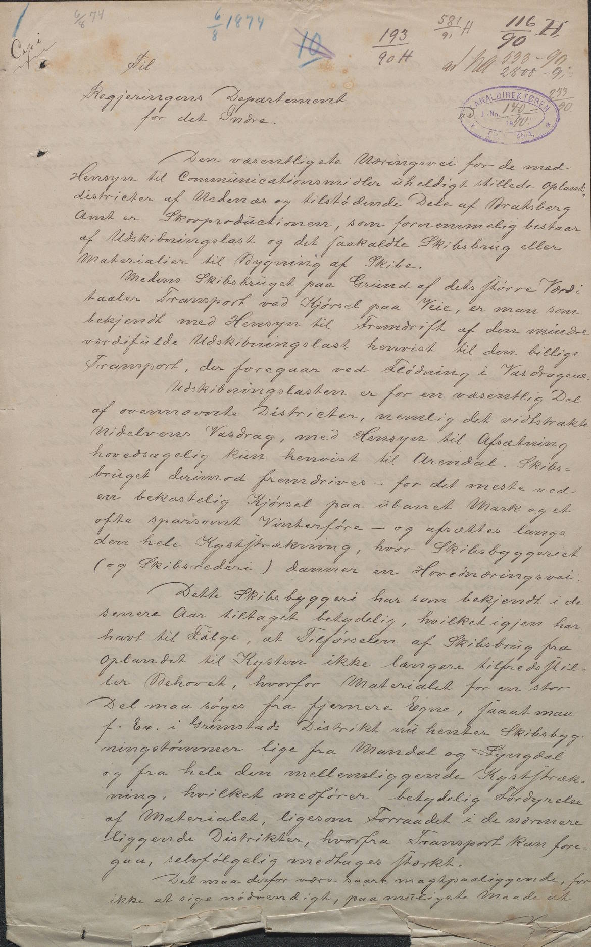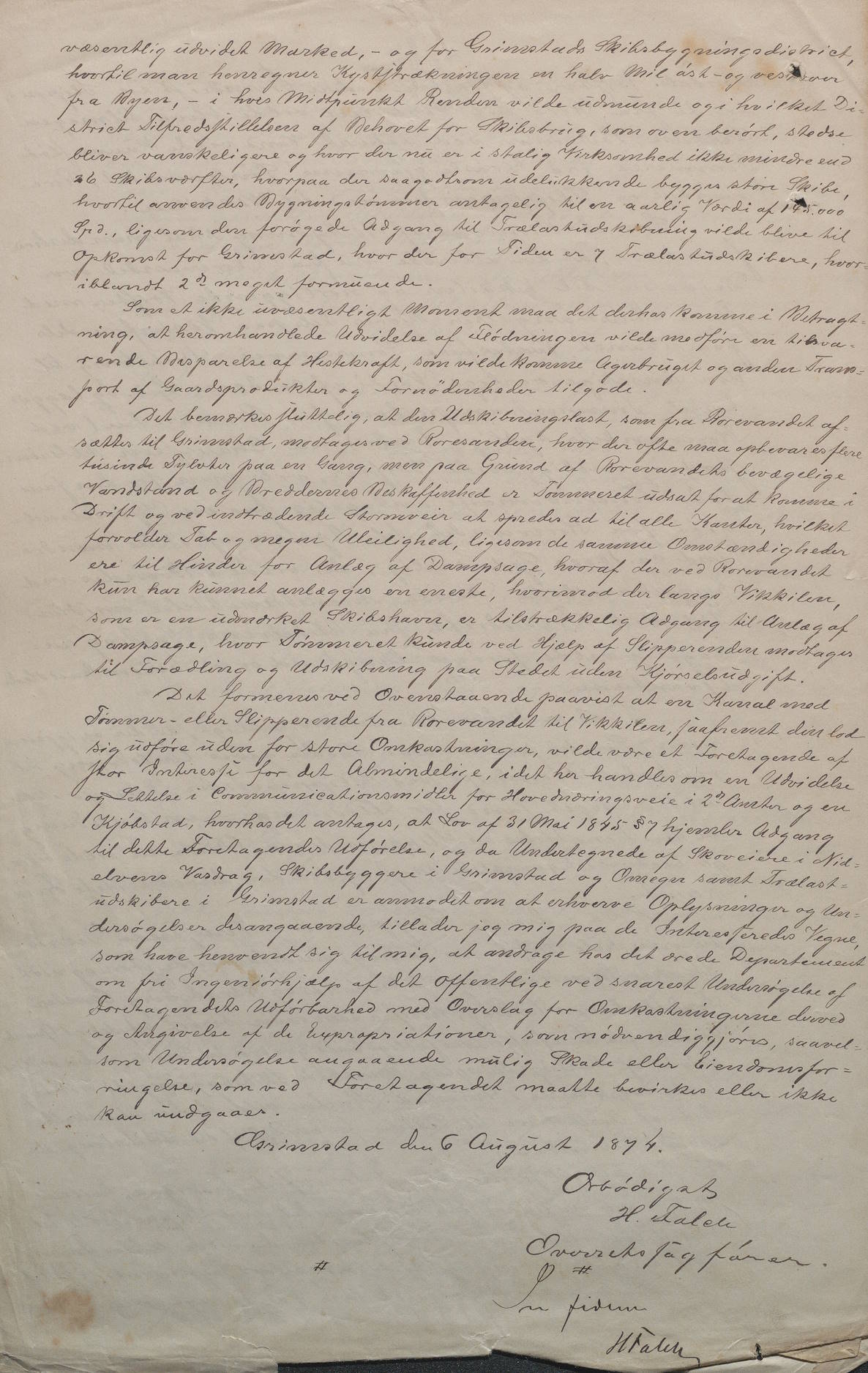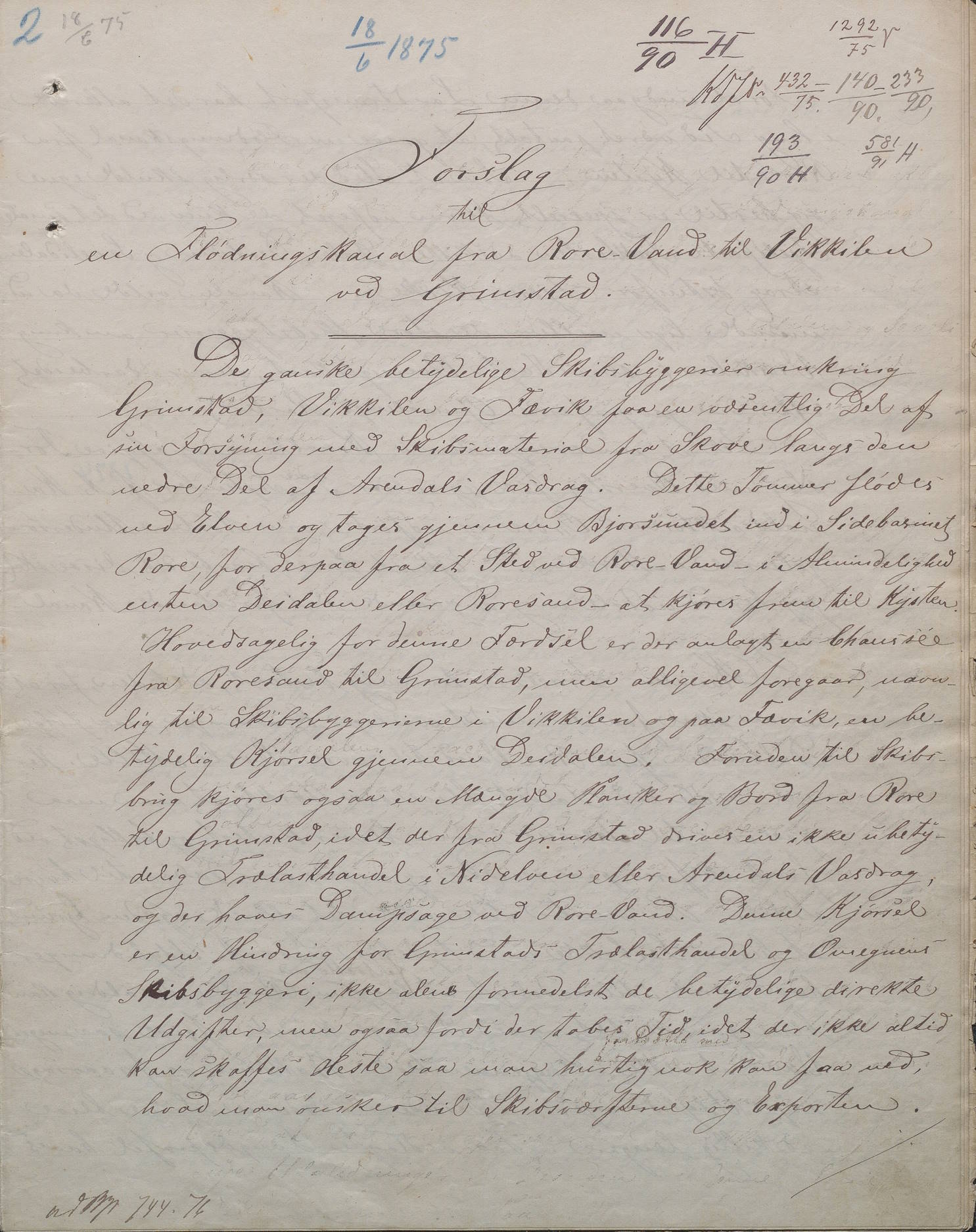 6. august 1874 ble det sendt et brev til «Regjeringens Departement for det Indre». Bak brevet stod flere skipsbyggere, skogeiere og trelasthandlere i Grimstadområdet. I brevet ble departementet bedt om å sende ingeniører til Grimstad for å utrede mulighetene for en kanal. Kanalen skulle gå fra Rorevand til Vikkilen.