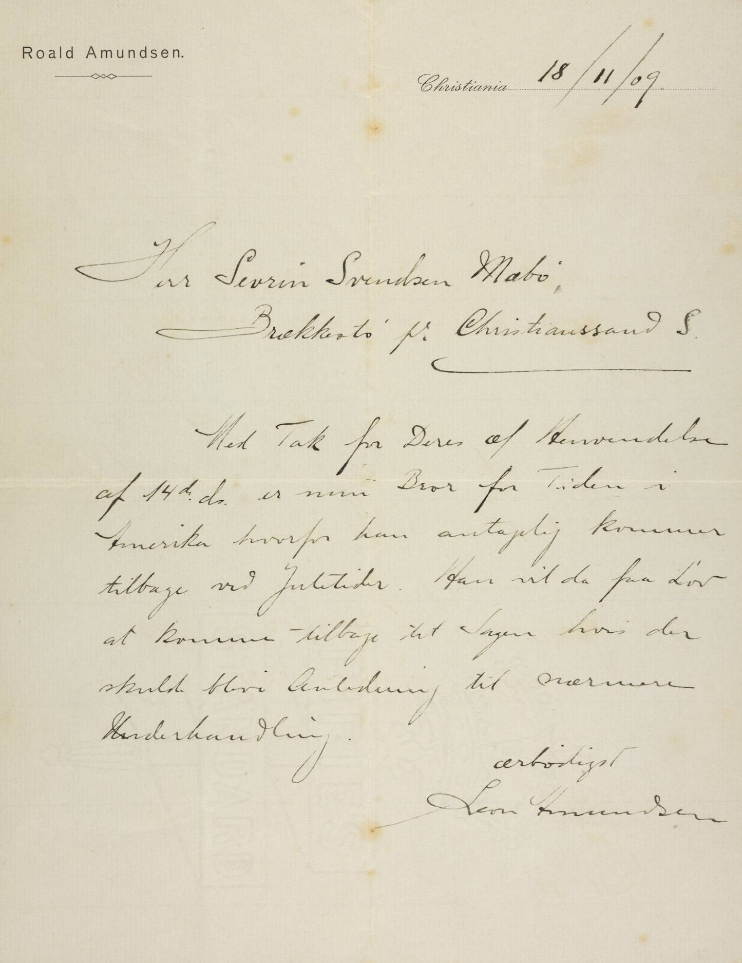 Svendsen kontaktet den norske polfareren Roald Amundsen, som i 1909 selv planla en Nordpol-ekspedisjon, trolig for å tilby sine tjenester. Han fikk imidlertid svar fra Roalds bror, Leon Amundsen, om at polfareren var i Amerika, men ventet hjem til juletider.