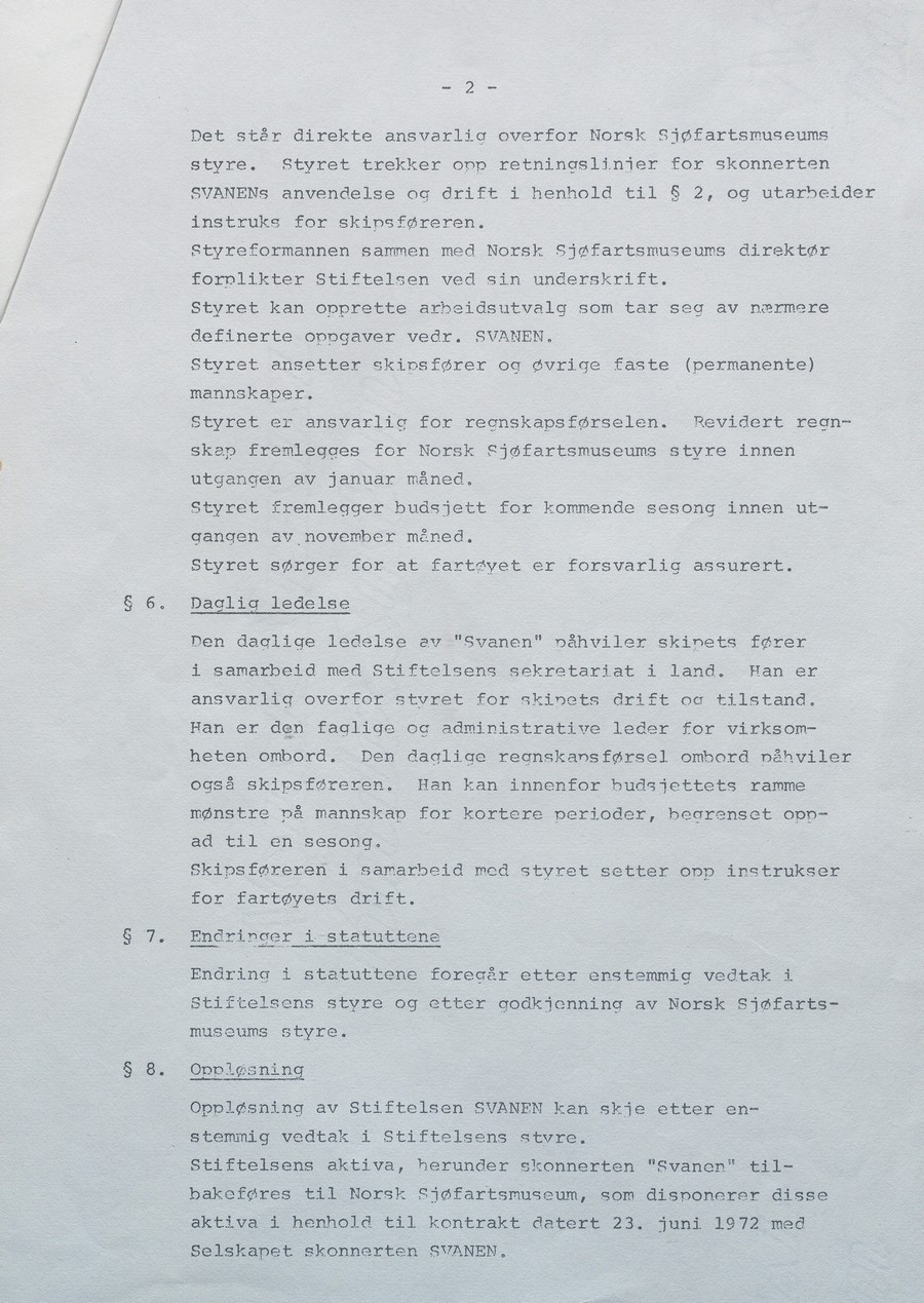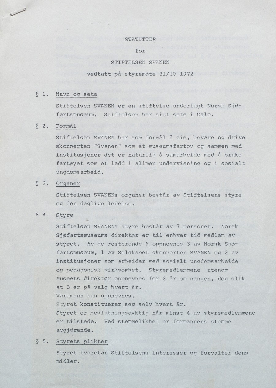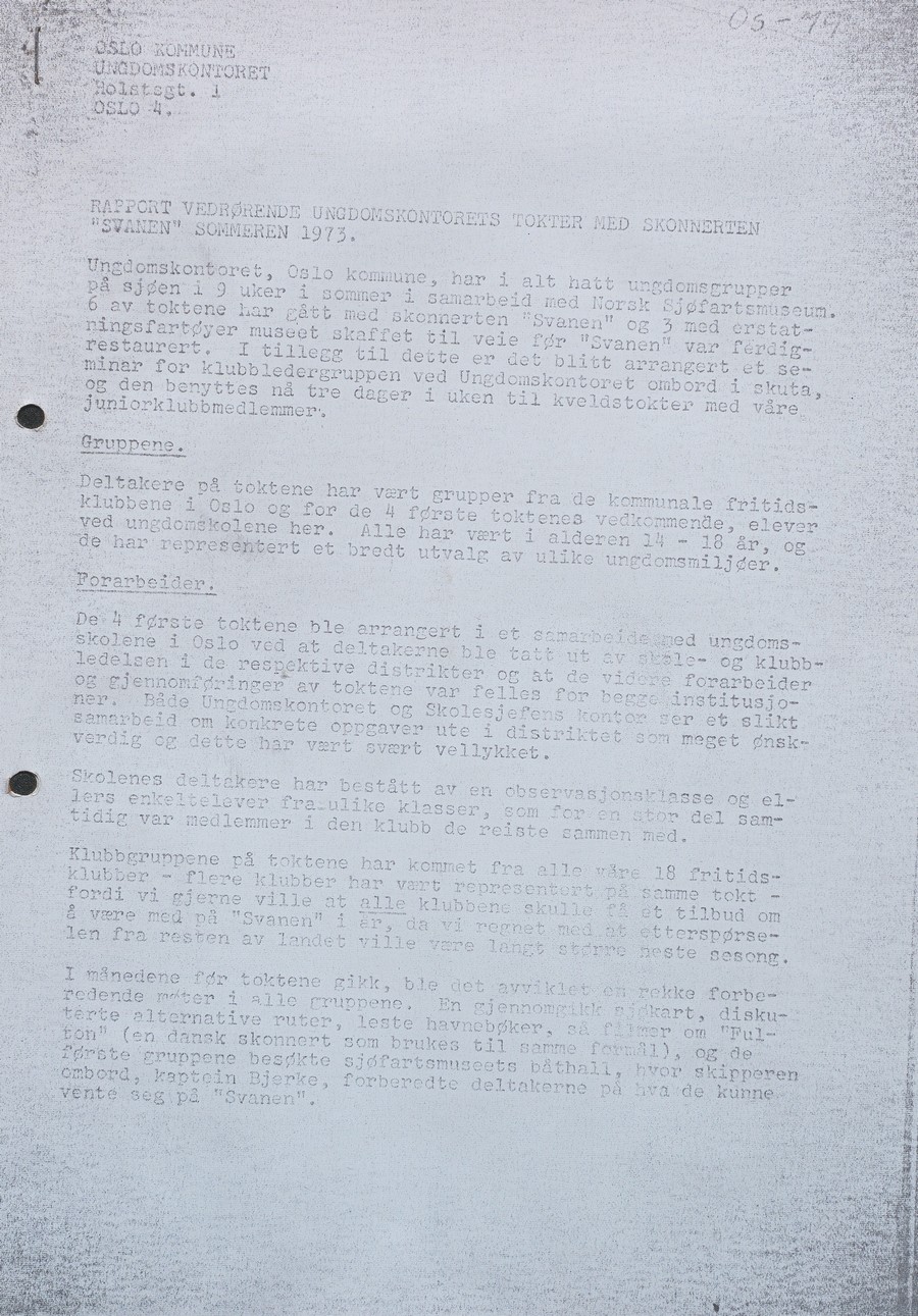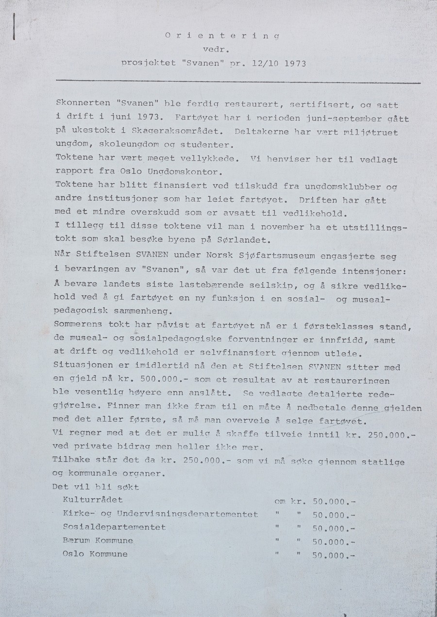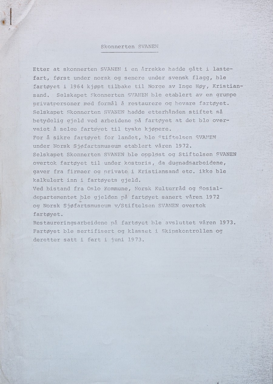 Skipet skulle fortsatt være registrert med hjemmehavn i Kristiansand, men driften skulle Norsk Sjøfartsmuseum i Oslo stå for. Fortsatt var det restaureringsarbeid som måtte utføres, men sommeren 1973 var «Svanen» klar for tokt med ungdom fra hovedstaden.