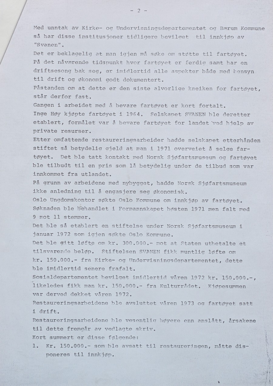 «Svanen» var en gammel frakteskute og tilfredsstilte ikke tidens krav. Verken det offentlige eller private næringsdrivende var i utgangspunktet interessert i å bruke penger på å restaurere den gamle skonnerten.