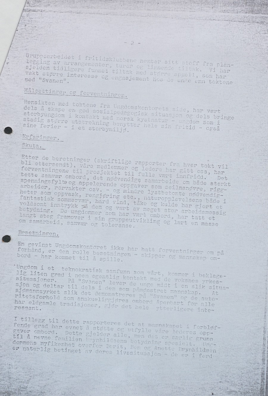 26. juni 1973 seilte de første ungdommene ut på en ukes tokt. Etter 12 tokt hadde i alt 330 ungdommer deltatt. Resultatet var over all forventning. Ikke bare hadde ungdommene opplevd å leve om bord i ei seilskute. De hadde også lært masse om samarbeid, samvær og toleranse.