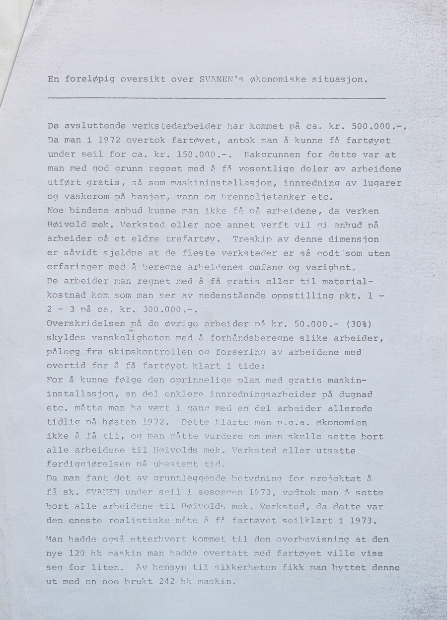 Til tross for suksessen, spøkte det for en videre fortsettelse. Restaureringsarbeidet som var blitt utført i 1972 og 1973 hadde kostet langt mer enn forventet. «Svanen» var derfor igjen et skip tynget av gjeld og med en usikker fremtid.