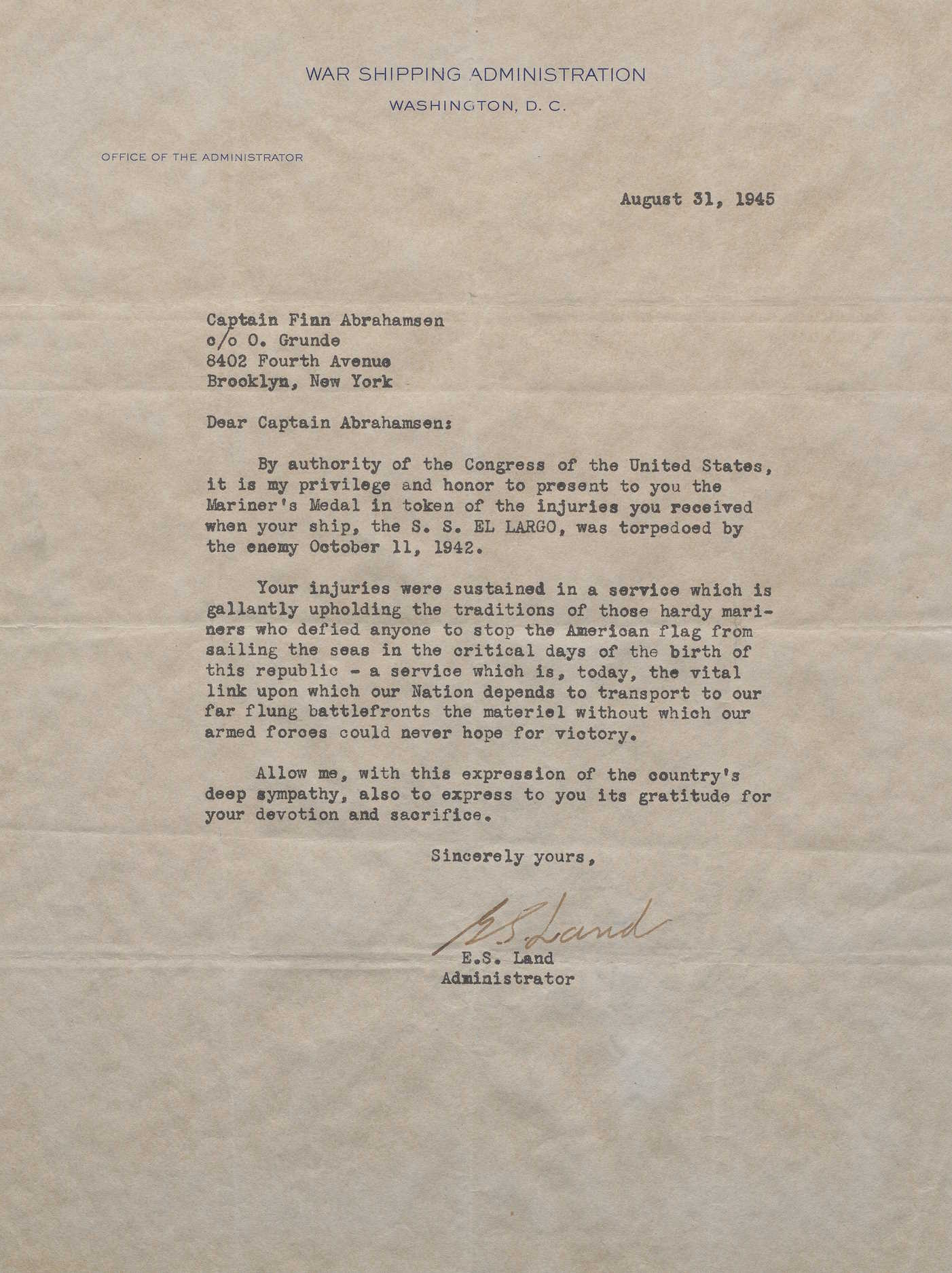 Den 5. oktober 1942 skulle «El Lago» gå i ballast fra Reykjavik til New York. Om bord var et mannskap på 57 personer fra 14 forskjellige nasjoner, hvorav syv nordmenn, deriblant to fra Høvåg. Skipets kaptein Finn Abrahamsen og hans nevø, styrmann Anker Øresland (1916-1942). Finn Abrahamsen hadde vært kaptein om bord siden sommeren 1941 og så langt i krigen unngått forlis. Men denne overfarten skulle ende i tragedie.