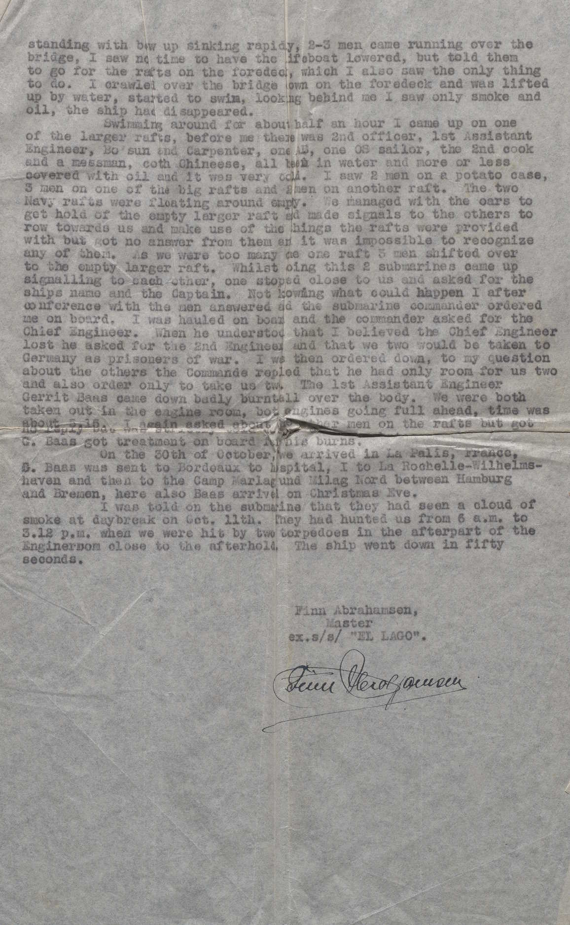 Han satte kurs mot kartrommet for å hente et livbelte, samt skipets journal og boksen med hemmelige dokumenter som måtte kastes over bord. Da han kom frem, var det umulig å gå inn – flammer og tett røyk veltet ut gjennom døren. Skipet sank raskt, og Abrahamsen forsto at han måtte komme seg over bord. Han kastet seg i det kalde vannet og begynte å svømme. Da han snudde seg for å se tilbake, var “El Lago” allerede forsvunnet i dypet. Alt som var igjen var olje og røyk.