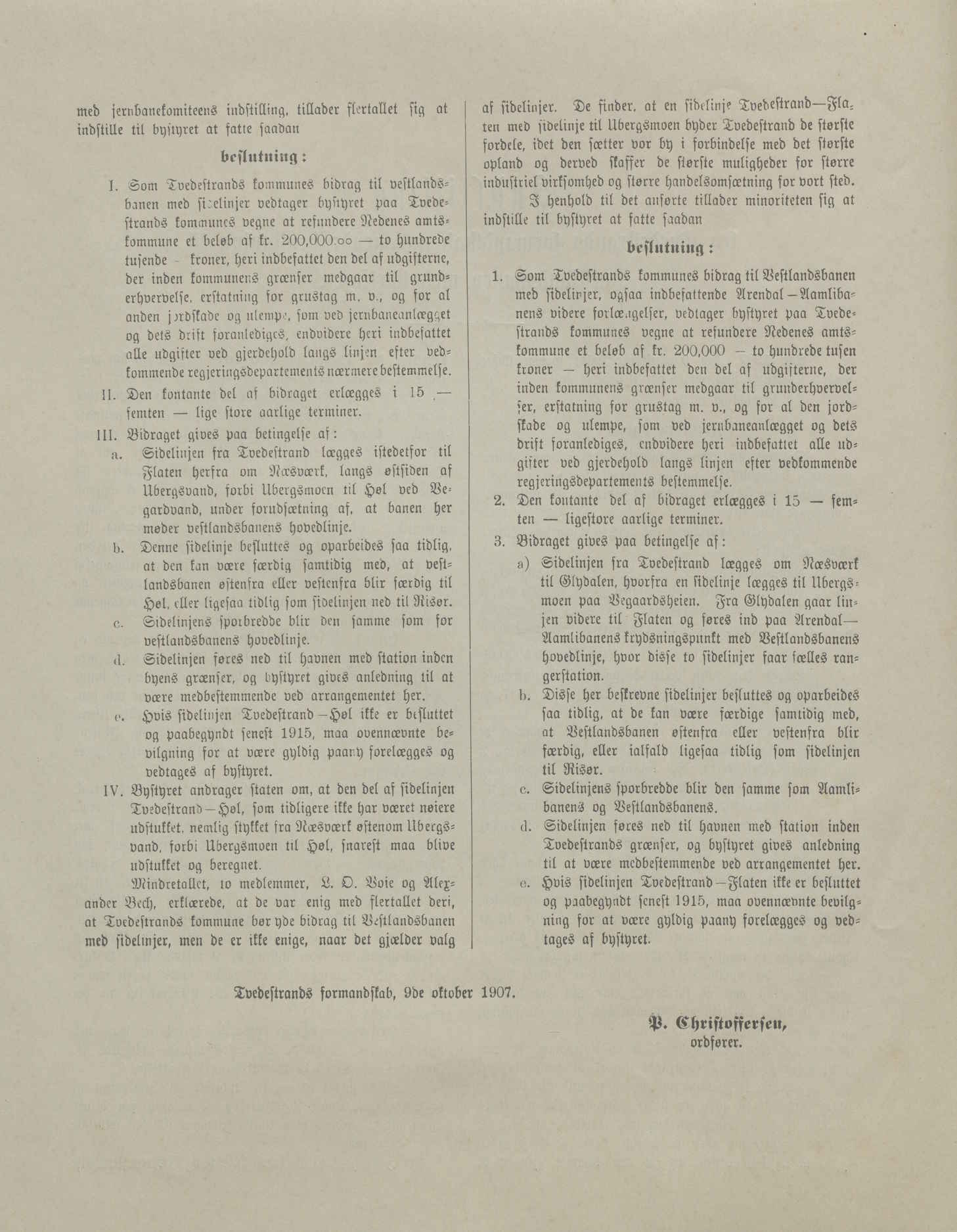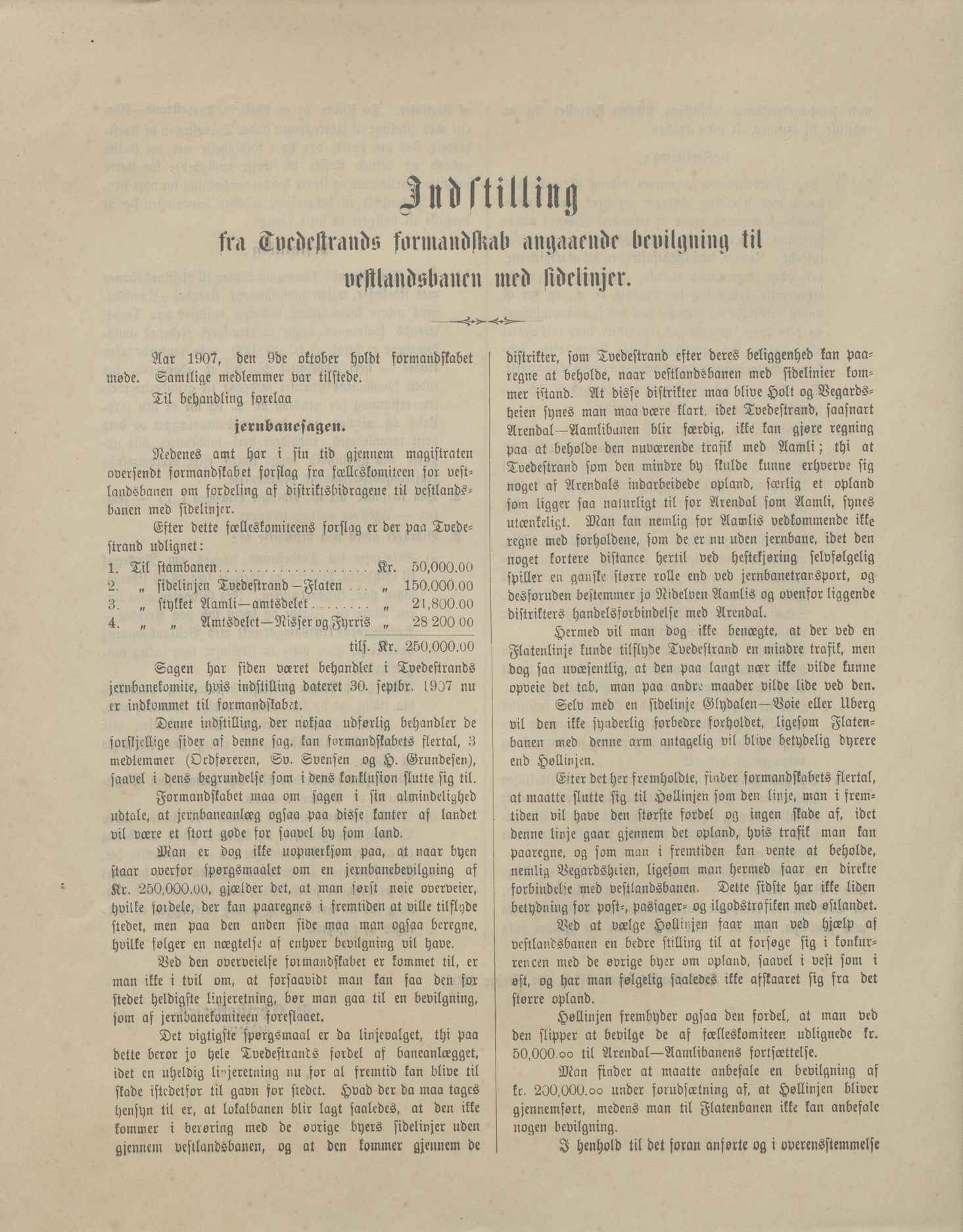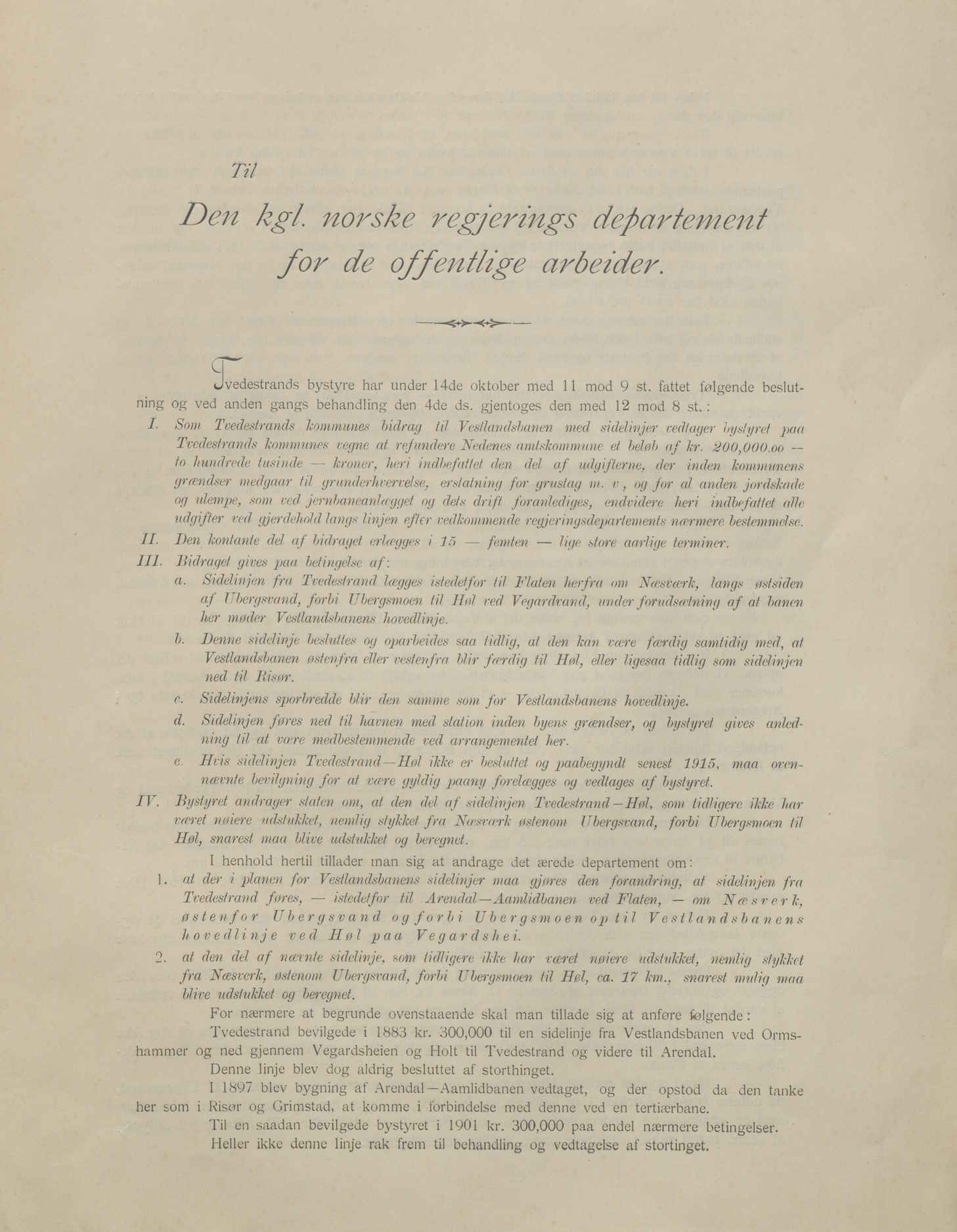Dersom dette ble realisert, ville Tvedestrand bevilge 200 000 kroner til jernbanebyggingen i distriktet. Dette var 50 000 kroner mindre enn hva amtet hadde etterspurt. Tvedestrand ønsket nemlig ikke å bidra til å finansiere Arendalsbanens videre vei mot Åmli. Pengene skulle kun brukes til Vestlandsbanen og Tvedestrandsbanen.