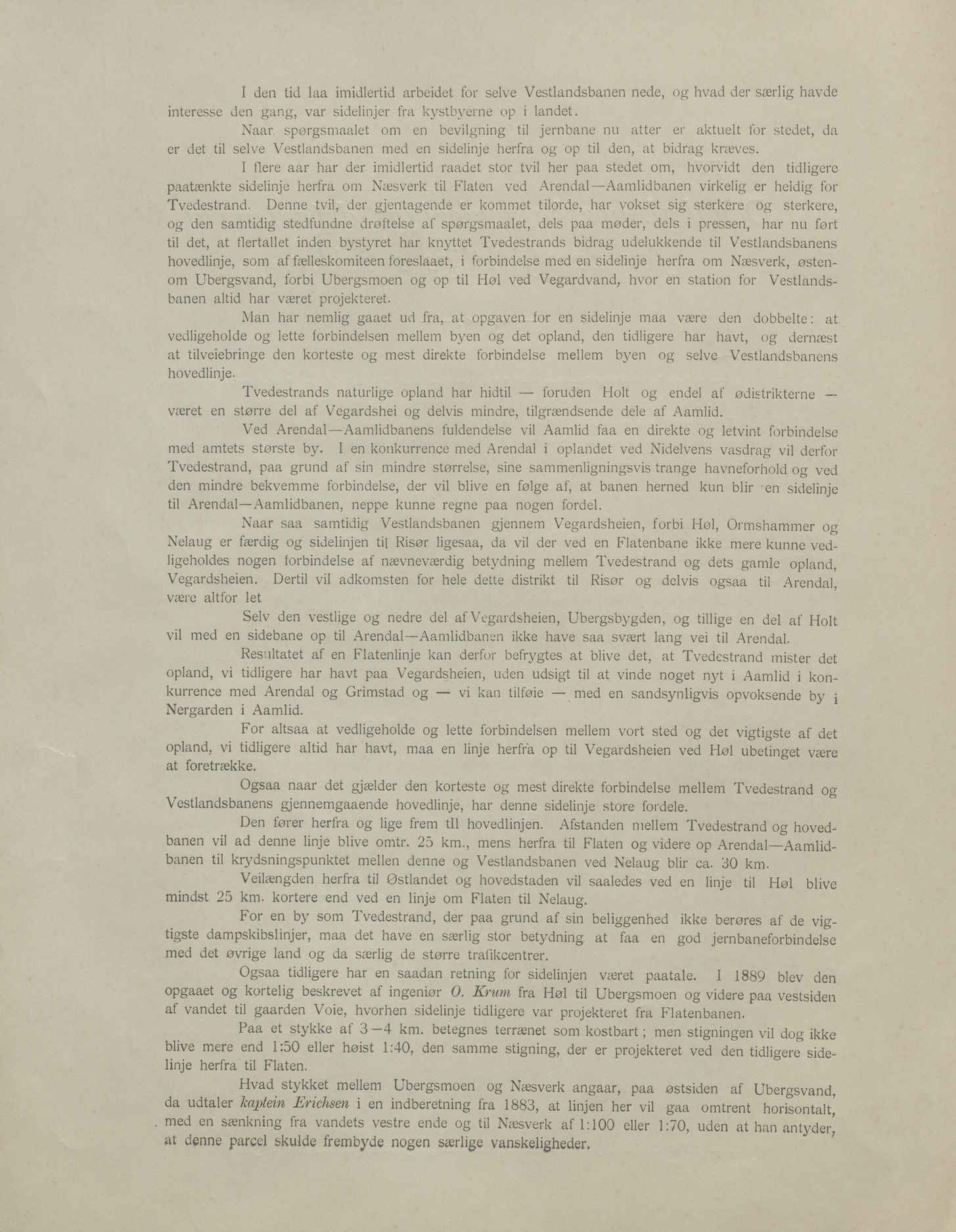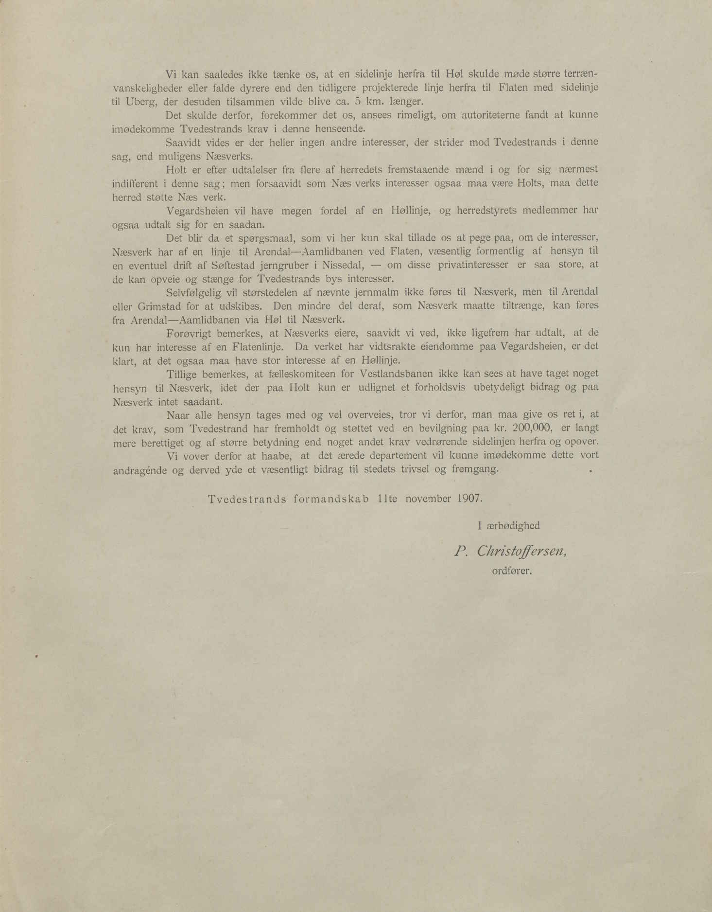 I sin innstilling i jernbanesaken 9. oktober 1907 gjorde formannskapet i Tvedestrand dette klart. «Hvad der da maa tages hensyn til er, at lokalbanen blir lagt saaledes, at den ikke kommer i berøring med de øvrige byers sidelinjer uden gjennem vestlandsbanen, og at den kommer gjennem de distrikter, som Tvedestrand efter deres beliggenhed kan paaregne at beholde, naar vestlandsbanen med sidelinier kommer istand.»