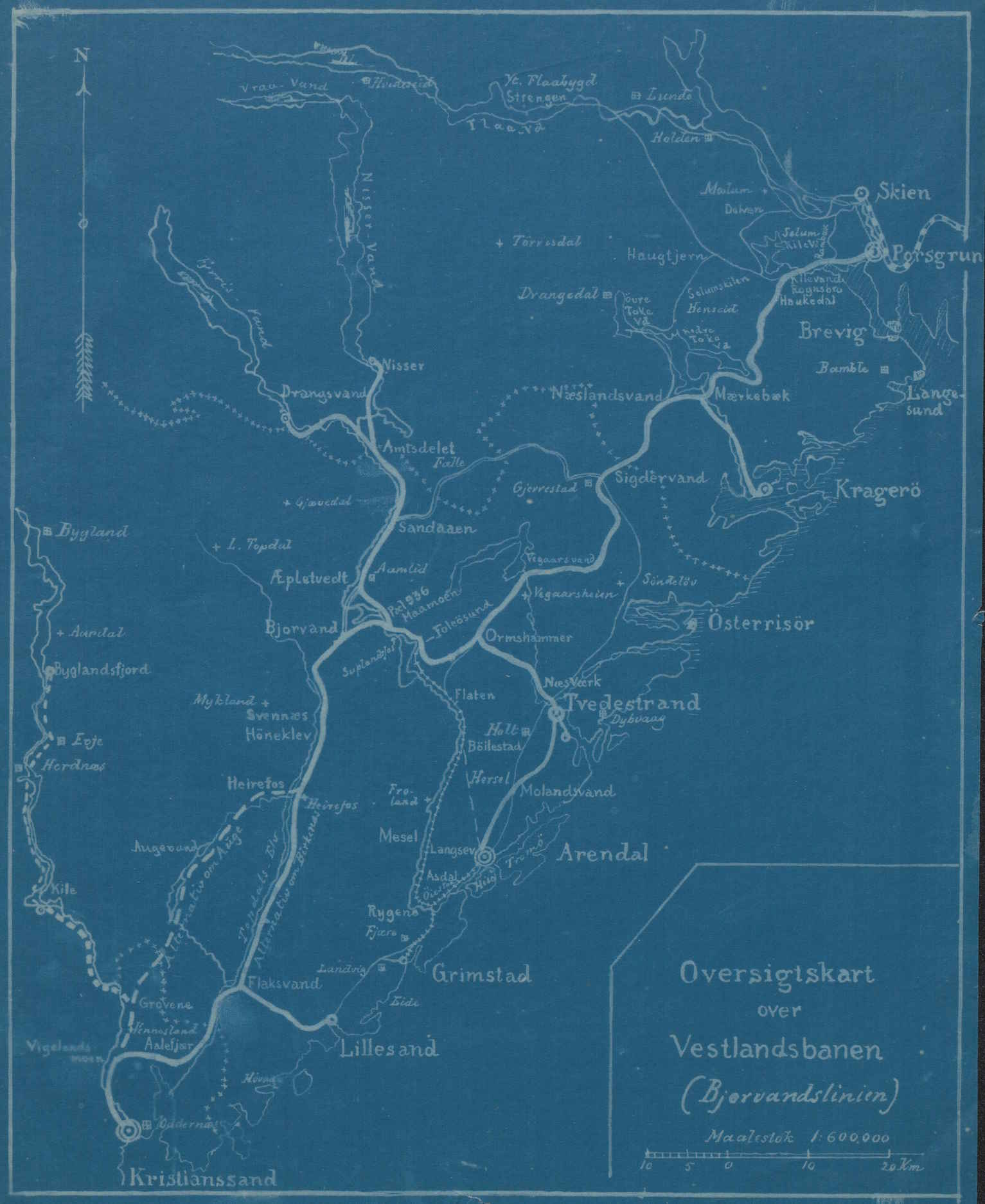 I 1915 hadde en endelig kommet i gang med en stambane til Sørlandet. Banen hadde da endret navn til Sørlandsbanen. Noen bane mellom Tvedestrand og Høl var imidlertid ikke påbegynt. Den kom heller aldri til å bli realisert. På KUBEN i Arendal finner en imidlertid avtrykk etter planene.